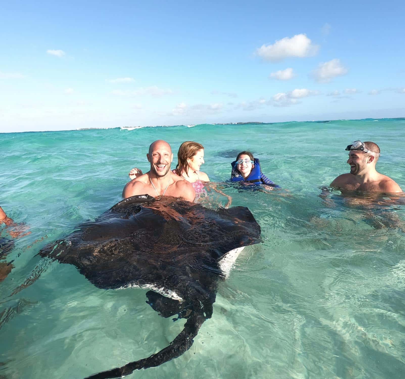 The next stop is Grand Caymans’ famous Stingray City Sandbar. Swim alongside graceful southern stingrays as they gather to greet you. These gentle creatures are very comfortable with their human guests. Captain Chris can teach you to feed them or hold one of the silky soft stingrays, But the adventure doesn’t end there.